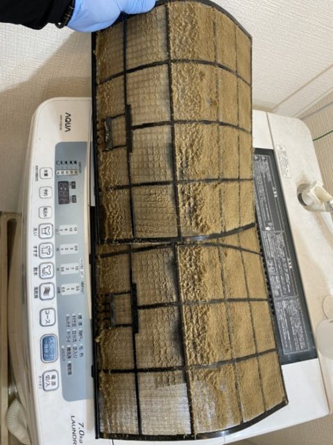 タバコを吸わない部屋のフィルターであれば、フィルターを掃除機で吸う事を月1で行えばこのようにはなりませんが、タバコはヤニでホコリと絡まりフィルターにこびりつきます。